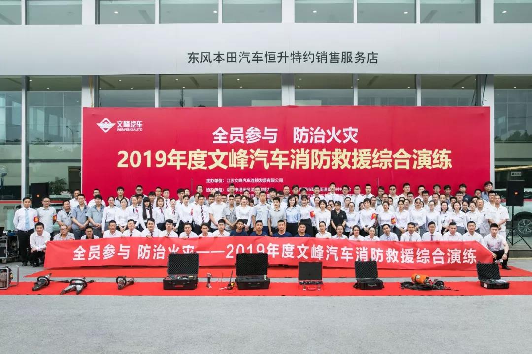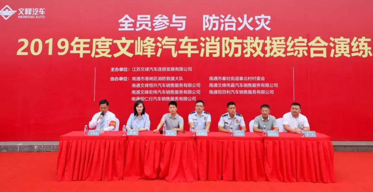 為增強員工的消防意識,普及員工的消防知識,提高應急避險、逃生自救的能力,6月19日,文峰汽車與南通市港閘區消防救援大隊、秦北村村委會聯合舉辦2019年度文峰汽車消防救援綜合演練,一汽大眾、廣汽豐田、東本恒升、別克、凱迪拉克全體員工共同參與。港閘區消防救援大隊大隊長施海忠、中隊長樊龍俊、秦北村村委會書記徐建成、安全員李平、文峰汽車總裁陳曉、文峰汽車副總經理顧毅出席活動。