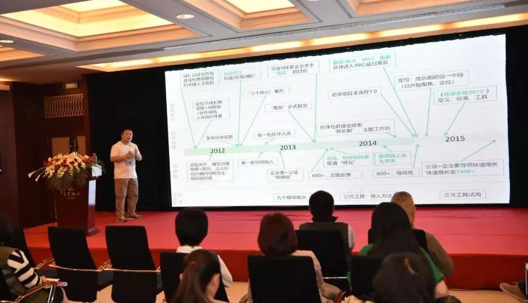 阿拉善SEE基金會行業組高級項目經理王亦慶將勁草同行七年的發展概括為兩個階段。2012~2015年屬于第一階段,在這一階段,項目提出了資助、導師制、伙伴網絡三大核心,確定了勁草1.0版本的服務體系;2016~2019年屬于第二階段,在這一階段勁草同行發生很多變化,并逐漸形成一套特有的產品與服務。
