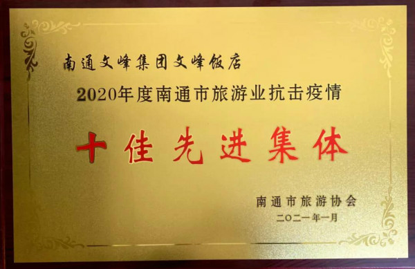 南通文峰飯店獲得2020年度南通市旅游業“先進集體”榮譽稱號