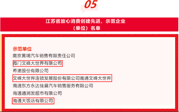 近日,江蘇省放心消費創建活動辦公室和江蘇省市場監督管理局聯合發文,表彰了一批2020年度全省放心消費創建先進示范單位,江蘇文峰集團旗下多家單位憑借優異的表現獲得了此項殊榮。