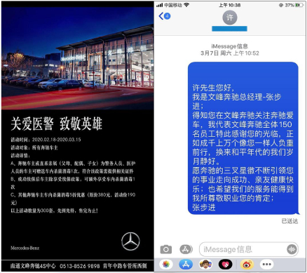 疫情并沒有阻隔我們向英雄致敬,在全國疫情緊張的情況下,南通當(dāng)?shù)蒯t(yī)療救援隊也支援了武漢。為致敬英雄,南通文峰奔馳店對所有醫(yī)護(hù)人員、警務(wù)人員車主提供了免費車內(nèi)殺菌消毒服務(wù),奔馳店負(fù)責(zé)人還向英雄們發(fā)送了致敬關(guān)愛短信。