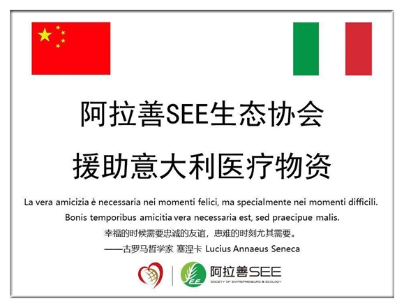 “幸福的時候需要忠誠的友誼,患難的時刻尤其如此”,這句古羅馬哲學(xué)家塞涅卡的名言,也特意印制在了此次阿拉善SEE捐助意大利的醫(yī)療物資包裝上。值得一提的是,這名言的意大利語和拉丁語校對的志愿者Daniela,也來自意大利,是“阿拉善SEE志愿者”體系注冊的411號志愿者。